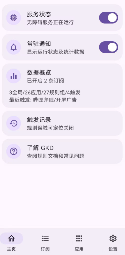 gkd跳过广告软件是一款免费跳过广告的应用,它可以自动跳过软件内的任意弹窗广告,让用户可以迅速进入应用而无需被广告打断,为用户带来更便捷的广告跳过纯净使用体验。相比于其他跳广告软件,gkd官方版能够通过智能识别和过滤技术更加快速的帮助用户跳
